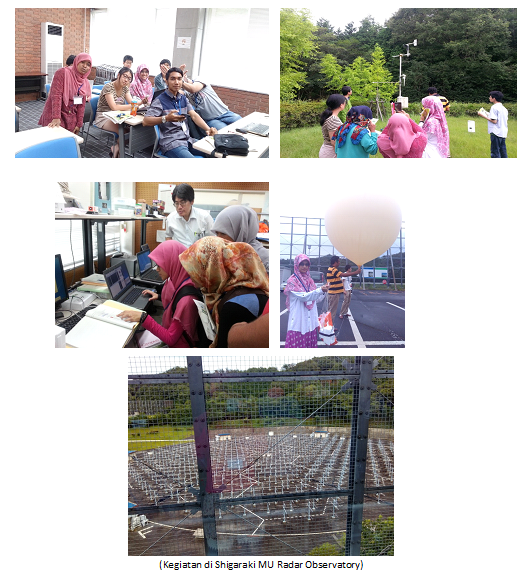 Kegiatan pertama di Jepang adalah pengenalan tempat tinggal yaitu Obaku International House. Selanjutnya, mengikuti rangkaian kegiatan di Shigaraki MU Observatory di Shigaraki selama tiga hari (18 Agustus 2015 – 20 Agustus 2015). Shigaraki MU Observatory didirikan pada tahun 1972 dan pada tahun 1976 Shigaraki MU Observatory mengumumkan proposal MU Radar pertamanya. Shigaraki MU Observatory sudah mengoperasikan MU Radar yang mempunyai prestasi terbaik didunia dan salah satu atmospheric radar terbesar di Asia yang mempunyai antenna yang sangat besar berdiameter 103 m. Saya dan rekan-rekan mengikuti observasi tentang Peluncuran Radiosonde dan mendapatkan beberapa materi yang berkaitan dengan atmosfer disini, diantaranya adalah GPS/GNSS Meteorology, Lidar Remote Sensing for the enviromental monitoring, The atmosphere : oxidizing medium in global biogeochemical cycles, Ground Weather Observations, dan Atmospheric Radar (Wind Profiler Radar) Observations. Tujuan observasi disini adalah agar kami mengerti prinsip pengukuran tentang bermacam-macam teknik observasi atmosfer dan mengetahui fenomena-fenomena yang terjadi di atmosfer. Tempat observasi ini sangat bagus, karena mempunyai peralatan yang sangat lengkap.