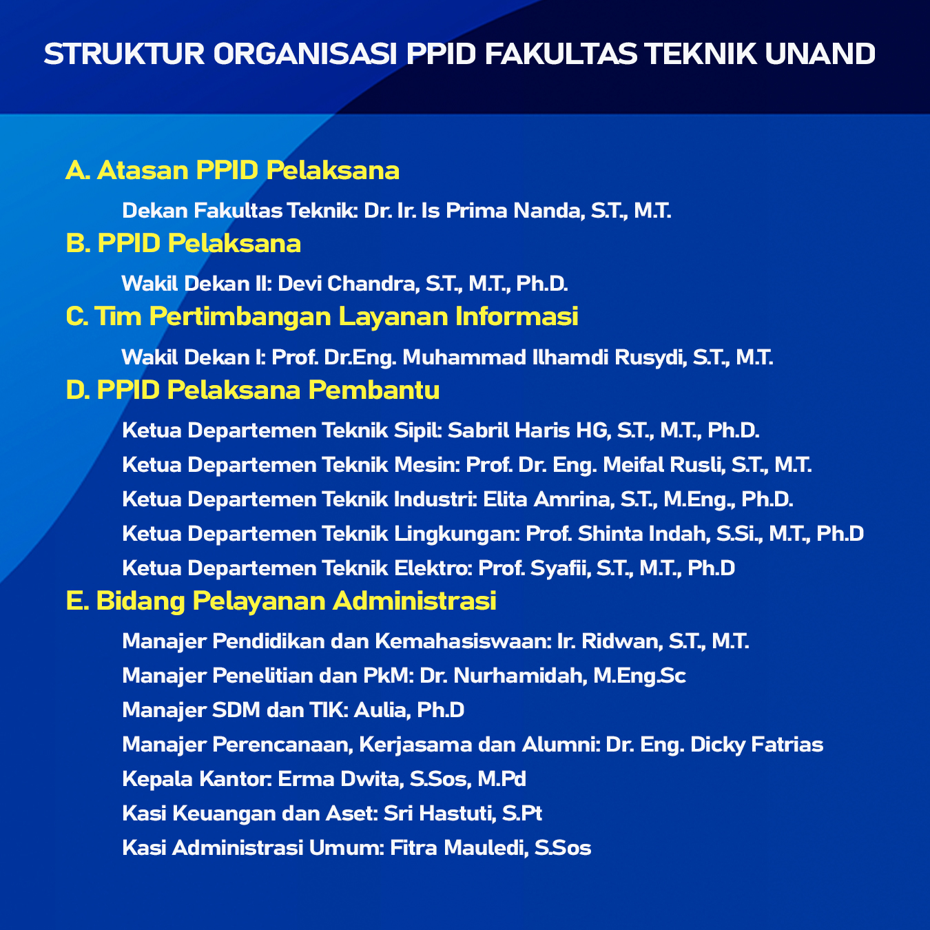 Berdasarkan Surat Keputusan Rektor Nomor : 1305/KPT/R/PTN-BH/UNAND/2022 ini, perbedaan struktur organisasi PPID terlihat dengan mengangkat Sekretaris Universitas (Ex-Officio) menjadi PPID Pelaksana yang bertugas merencanakan, mengorganisasikan, melaksanakan, mengawasi, dan mengevaluasi pelaksanaan kegiatan pengelolaan dan pelayanan informasi di Lingkungan Universitas Andalas.